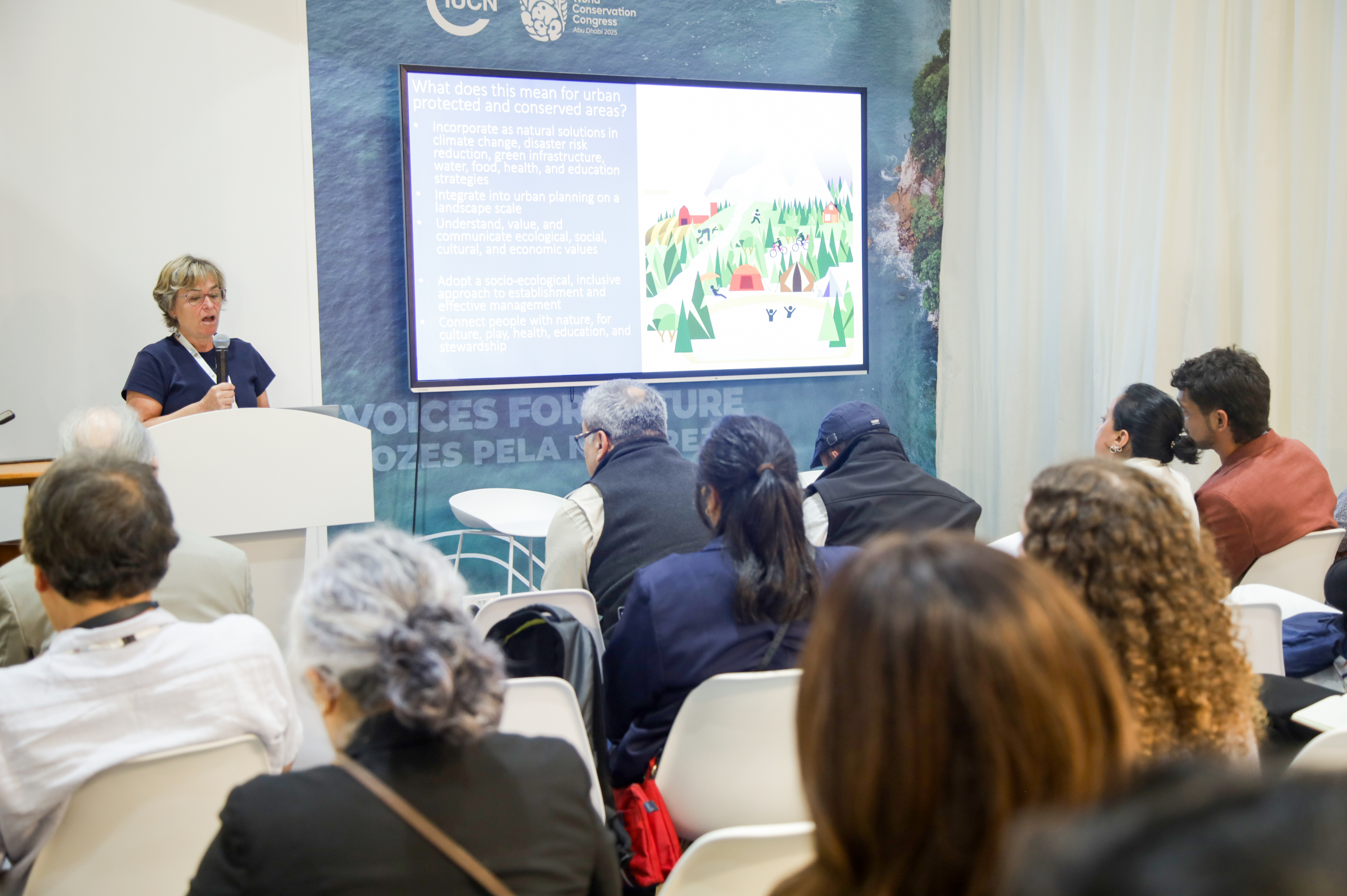 Las sesiones exploraron temas que abarcan desde la conectividad ecológica en áreas marinas protegidas y la protección de la zona crepuscular del océano, hasta sistemas alimentarios sostenibles arraigados en el conocimiento indígena, finanzas verdes alineadas con resultados positivos para la naturaleza y marcos emergentes para la justicia ambiental y climática.
