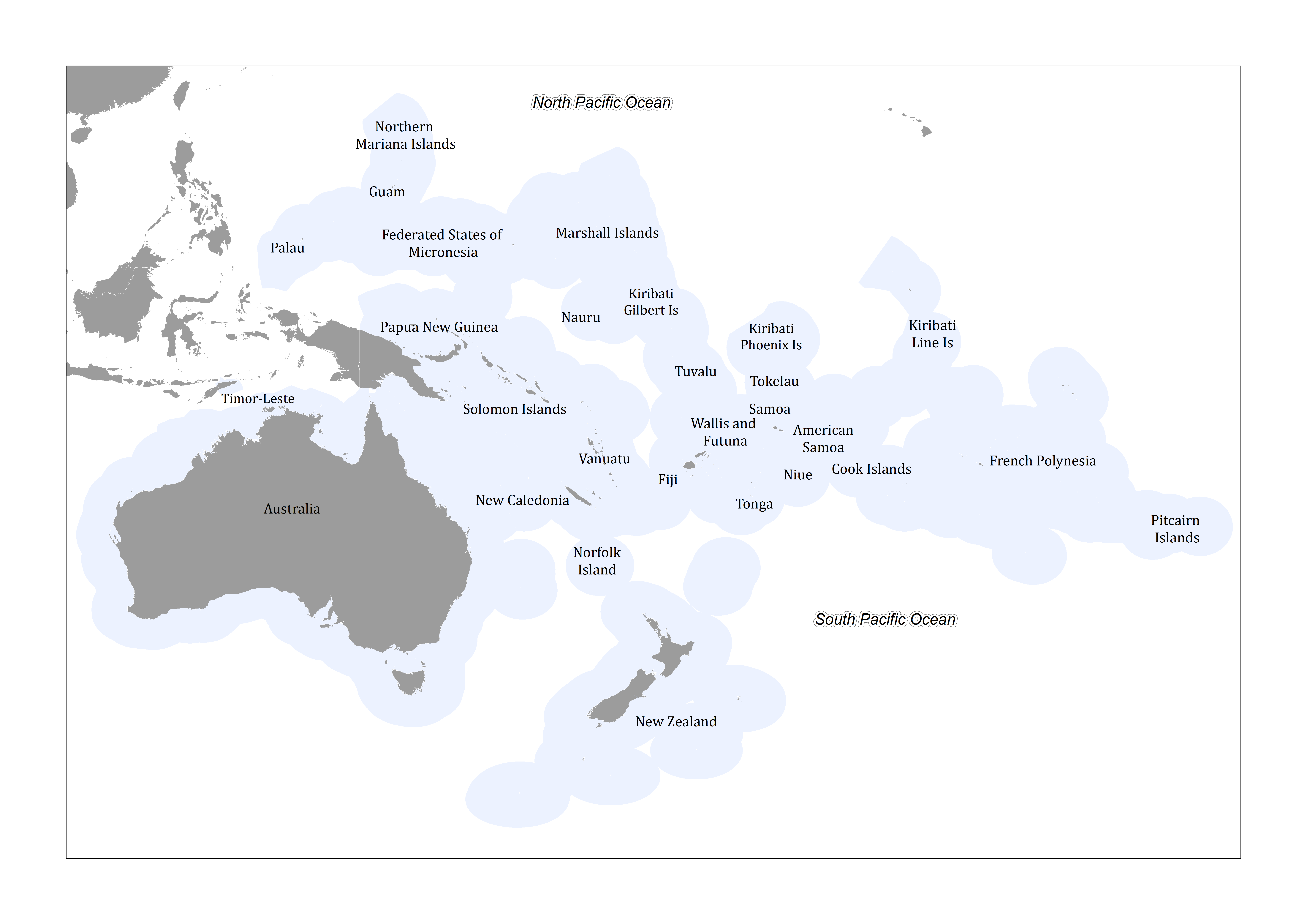 The region stretches almost 12,000km from East to West and 6,000km from North to South, with a combined Exclusive Economic Zone  of close to 40 million square km. In contrast, the total land area is just over 8.5 million square km, with the larger islands of Australia (7 million square km), Papua New Guinea (463,000 square km) and New Zealand (268,000 square km) accounting for approximately 93% of this total land area.