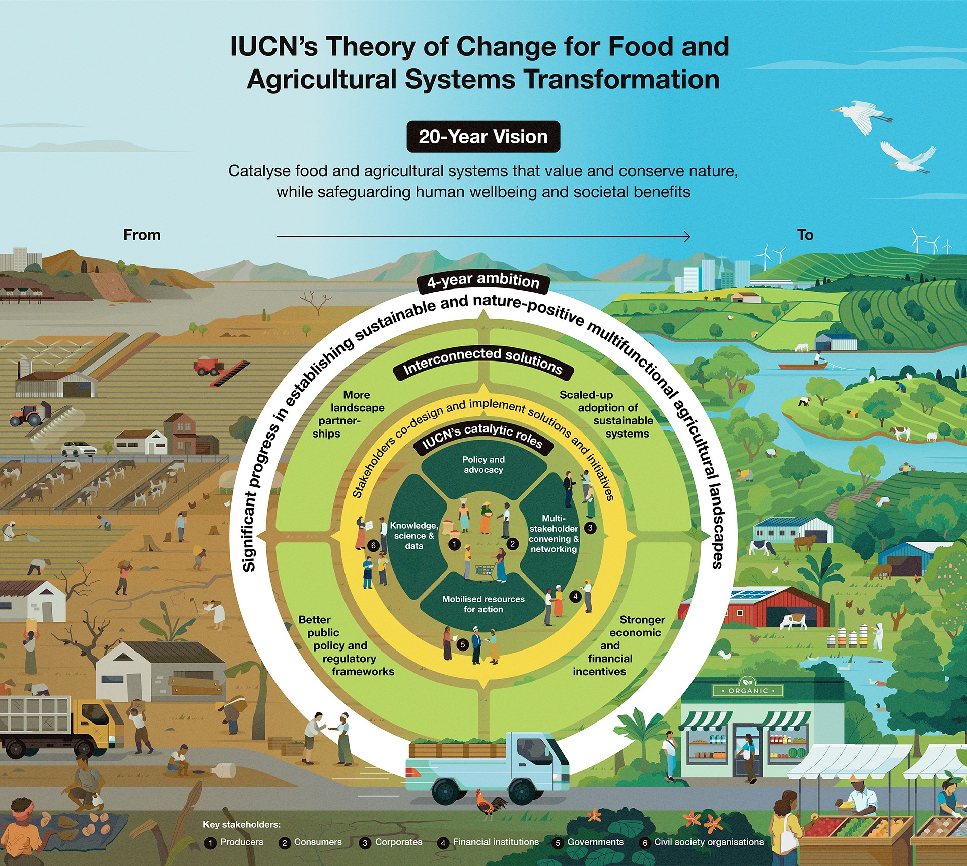 We show our Theory of Change as a series of concentric circles, with each circle driving change in the next layer. At the centre (dark green), IUCN applies its catalytic roles to support the momentum for change for a wide range of stakeholders (listed at the foot of the graphic) who co-design and implement solutions and initiatives. These catalyse change in 4 interconnected solution areas (light green) which combine together to add up to our 4-year ambition in the outer white circle. This change process will move Food and Agricultural Systems from the unsustainable and degraded state shown on the left-hand side to the positive situation shown on the right.